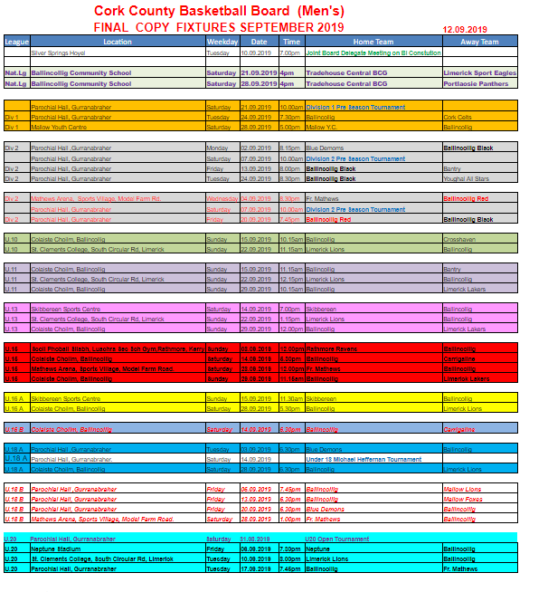| U.18 B | Mathews Arena, Sports Village, Model Farm Road. | Saturday | 28.09.2019 | 1.00pm | Fr. Mathews | Ballincollig |